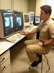 | Keywords: US Navy 030221-N-2338M-001 Navy Radiologist Lt. Cmdr. Roy Rice, MC, reviews a digital X-ray before importing it into the Comfort^rsquo,s RADWORKS system.jpg en Aboard the Military Sealift Command Hospital Ship USNS Comfort T-AO 20 Feb 21 2003 -- Navy Radiologist Lt Cmdr Roy Rice MC reviews a digital X-ray before importing it into the Comfort s IMPAX system a computer program that allows him to send and receive X-rays to and from virtually any ship in the fleet or ashore medical facility U S Navy photo by Journalist 2nd Class Ellen Maurer RELEASED 2003-02-21 030221-N-2338M-001 Navy http //www navy mil/view_image asp id 4743 U S Navy photo by Journalist 2nd Class Ellen Maurer PD-USGov-Military-Navy Aboard USNS Comfort T-AH-20 |