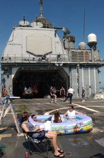 Keywords: US Navy 030316-N-4655M-001 Crewmembers relax on the main deck of the guided missile cruiser USS Bunker Hill (CG 52).jpg en The Arabian Gulf Mar 16 2003 -- Crewmembers relax on the main deck of the guided missile cruiser USS Bunker Hill CG 52 during a Steel Beach Picnic held aboard ship Bunker Hill is currently forward deployed in the Arabian Gulf conducting missions in support of U N sanctions against Iraq and other tasks in support of Operation Enduring Freedom U S Navy photo by Photographer's Mate 2nd Class Richard Moore RELEASED 2003-03-16 030316-N-4655M-001 Navy http //www navy mil/view_image asp id 5279 U S Navy photo by Photographer's Mate 2nd Class Richard Moore PD-USGov-Military-Navy Aboard USS Bunker Hill CG-52 Steel Beach Picnics |