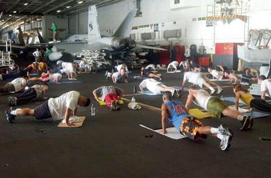 Keywords: US Navy 030317-N-9403F-001 Sailors participate in a workout led by the ship^rsquo,s Explosive Ordnance Disposal (EOD) team in the hanger bay aboard the aircraft carrier USS Abraham Lincoln (CVN 72).jpg en The Arabian Gulf Mar 17 2003 -- Sailors participate in a workout led by the ship s Explosive Ordnance Disposal EOD team in the hanger bay aboard the aircraft carrier USS Abraham Lincoln CVN 72 While anyone aboard is invited to attend the one-hour exercise strengthens and conditions Sailors for the demanding physical requirements of the EOD Lincoln and Carrier Air Wing Fourteen CVW 14 are conducting combat operations in support of Operation Southern Watch U S Navy photo by Photographer's Mate Airman Jason Frost RELEASED 2003-03-17 030317-N-9403F-001 Navy http //www navy mil/view_image asp id 5310 U S Navy photo by Photographer's Mate Airman Jason Frost PD-USGov-Military-Navy Aboard USS Abraham Lincoln CVN-72 Sailors from the United States Navy Physical exercises