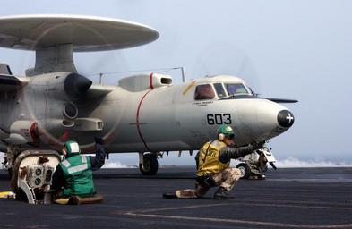 | Keywords: US Navy 030326-N-0905V-003 Shooter give the signal to launch an E-2C Hawkeye to prepare for launch from one of four steam driven catapults on the flight deck of USS Carl Vinson (CVN 70).jpg en Sea of Japan Mar 26 2003 -- A Shooter give the signal to launch an E-2C Hawkeye assigned to the Golden Hawks of Carrier Airborne Early Warning Squadron One One Two VAW-112 to prepare for launch from one of four steam driven catapults on the flight deck of USS Carl Vinson CVN 70 Carl Vinson and Carrier Air Wing Eleven CVW-11 are participating in Exercise Foal Eagle an annual joint and combined field training exercise between the U S and Republic of Korea armed forces The exercise is designed to strengthen relationships and improve interoperability between both nations through real world training scenarios U S Navy photo by Photographer's Mate Airman Chris M Valdez RELEASED 2003-03-26 030326-N-0905V-003 Navy http //www navy mil/view_image asp id 5812 U S Navy photo by Photographer's Mate Airman Chris M Valdez PD-USGov-Military-Navy Aboard USS Carl Vinson CVN-70 Northrop Grumman E-2C Hawkeye aircraft carrier take-offs Airborne Early Warning Squadron 112 United States Navy |