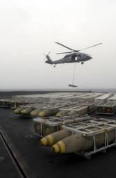 | Keywords: US Navy 030326-N-9234B-006 A SH-60F Knighthawk helicopter delivers ammunition during an ammo onload aboard USS Constellation (CV 64).jpg en The Arabian Gulf Mar 23 2003 -- A MH-60 Knighthawk helicopter delivers ammunition during an ammo onload aboard USS Constellation CV 64 in support of Operation Iraqi Freedom the multi-national coalition effort to liberate the Iraqi people eliminate weapons of mass destruction and end the regime of Saddam Hussein U S Navy photo by Photographer's Mate Airman Sean T Blake RELEASED 2003-03-23 030326-N-9234B-006 Navy http //www navy mil/view_image asp id 5792 U S Navy photo by Photographer's Mate Airman Sean T Blake PD-USGov-Military-Navy Aboard USS Constellation CV-64 |