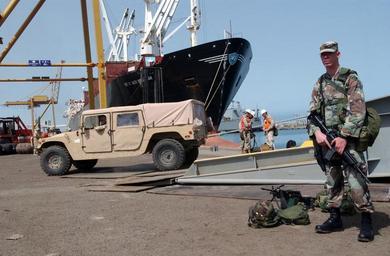 | Keywords: US Navy 030403-N-5362A-007 A U.S. Army High Mobility Multipurpose Wheeled Vehicle (HMMWV).jpg en Port Shuaiba Kuwait Apr 3 2003 -- A U S Army High Mobility Multipurpose Wheeled Vehicle HMMWV from the 4th Infantry Division 4th ID is unloaded from the military transport ship Cape Victory at the port of Shuaiba The 4th ID is the Army's most modern digitized division and deployed in support of Operation Iraqi Freedom Operation Iraqi Freedom is the multinational coalition effort to liberate the Iraqi people eliminate Iraq's weapons of mass destruction and end the regime of Saddam Hussein U S Navy photo by Photographer's Mate 1st Class Arlo K Abrahamson RELEASED 2003-04-03 030403-N-5362A-007 Navy http //www navy mil/view_image asp id 6283 U S Navy photo by Photographer's Mate 1st Class Arlo K Abrahamson PD-USGov-Military-Navy United States Navy in Ash Shuaybah Kuwait 4th Infantry Division United States Humvees in United States service Males with M4 carbine |
