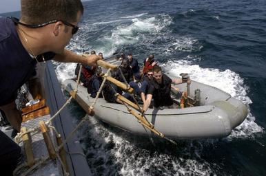 Keywords: US Navy 030507-N-6669N-003 A crewmember aboard Yard Boarding Craft Seven Zero Two (YP 702) passes the boarding ladder to the Maritime Interdiction Operation (MIO) and Vessel Board Search and Seizure (VBSS) team.jpg en At sea with USS Thomas S Gates CG 51 May 7 2003 -- A crewmember aboard Yard Boarding Craft Seven Zero Two YP 702 passes the boarding ladder to the Maritime Interdiction Operation MIO and Vessel Board Search and Seizure VBSS team from the guided missile cruiser USS Thomas S Gates U S Navy photo by Gary Nichols RELEASED 2003-05-07 030507-N-6669N-003 Navy http //www navy mil/view_image asp id 7423 U S Navy photo by Gary Nichols PD-USGov-Military-Navy USS Thomas S Gates CG-51 Visit Board Search and Seizure Rigid-hulled inflatable boats of US Navy