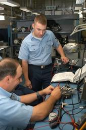 | Keywords: US Navy 030520-N-2911P-004 Sailors troubleshoot an Inter-Communications Set (ICS) jack box.jpg en Misawa Japan May 20 2003 -- Aviation Electronics Technician 3rd Class William Martel standing from Medford Ore and Aviation Electrician's Mate 1st Class Todd Fallquist from Omaha Neb troubleshoot an Inter-Communications Set ICS jack box The ICS is used by the P-3 Orion aircrews deployed to Misawa Air Base Petty Officer Martel is assigned to Patrol Squadron Nine VP-9 which is homeported at Marine Corps Air Station Kaneohe Hawaii and is currently on a routine deployment to Misawa Japan Petty Officer Fallquist is assigned to the Aircraft Intermediate Maintenance Detachment in Misawa U S Navy photo by Photographer s Mate 2nd Class John Parker RELEASED 2003-05-20 030520-N-2911P-004 Navy http //www navy mil/view_image asp id 7828 U S Navy photo by Photographer s Mate 2nd Class John Parker PD-USGov-Military-Navy Images from US Navy location MISAWA Japan Aviation Electrician's Mate |