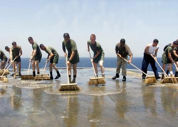 | Keywords: US Navy 030521-N-9109V-003 Sailors and embarked Marines flood the flight deck with salt-water solution, scrub brooms, and plenty of elbow grease in a mandatory wash down.jpg en Arabian Gulf May 21 2003 - Sailors and embarked Marines flood the flight deck with salt-water solution scrub brooms and plenty of elbow grease in a mandatory wash down aboard the amphibious assault ship USS Saipan LHA 2 Saipan is currently deployed in the Arabian Gulf in support of Operation Iraqi Freedom Operation Iraqi Freedom is the multinational coalition effort to liberate the Iraqi people eliminate Iraq's weapons of mass destruction and end the regime of Saddam Hussein U S Navy photo by Photographer's Mate Airman Kyle T Voigt RELEASED 2003-05-21 030521-N-9109V-003 Navy http //www navy mil/view_image asp id 11890 U S Navy photo by Photographer's Mate Airman Kyle T Voigt PD-USGov-Military-Navy Sweeping Pictures by Photographer's Mate Airman Kyle T Voigt Teamwork In United States Navy Aboard USS Saipan LHA-2 |