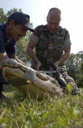 | Keywords: US Navy 030530-N-5862D-187 Chief Aviation Boatswain's Mate Rodger Wisdom and Fireman Jonathan Sirmon wrangle a ten-foot alligator.jpg en King's Bay Ga May 29 2003 -- Chief Aviation Boatswain's Mate Rodger Wisdom and Fireman Jonathan Sirmon wrangle a ten-foot alligator aboard Naval Submarine Base King's Bay Chief Wisdom is the base Game Warden and is responsible for the capture of wildlife that could present a danger to base personnel Alligators that reach 6 feet or larger are considered too dangerous for base personnel and their families and are removed The smaller ones generally don't represent a threat to base personnel or dependents unless they are cornered or harassed The captured alligators are released along the North River which is a remote area where they can live away from the base U S Navy photo by Chief Photographer's Mate Chris Desmond RELEASED 2003-05-29 030530-N-5862D-187 Navy http //www navy mil/view_image asp id 7772 U S Navy photo by Chief Photographer's Mate Chris Desmond PD-USGov-Military-Navy Military in Georgia U S state Aviation Boatswain's Mates |