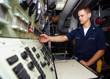 | Keywords: US Navy 030616-N-4374S-012 Gas Turbine Systems Technician 3rd Class Richard Lawton monitors the propulsion local control console.jpg en Baltic Sea Jun 16 2003 -- Gas Turbine Systems Technician 3rd Class Richard Lawton monitors the propulsion local control console PLCC in main engine room two aboard the guided missile cruiser USS Vella Gulf CG 72 Vella Gulf is participating in the annual maritime exercise Baltic Operations BALTOPS 2003 The United States and 12 other nations are participating in this year's exercise BALTOPS 2003 is intended to improve interoperability between allies and Partnership for Peace countries by conducting a peace support operation at sea including exercises in gunnery replenishment-at-sea undersea warfare radar tracking mine countermeasures seamanship search and rescue maritime interdiction operations and scenarios dealing with potentially real world crises U S Navy photo by Photographer's Mate 2nd Class Michael Sandberg RELEASED 2003-06-16 030616-N-4374S-012 Navy http //www navy mil/view_image asp id 8100 U S Navy photo by Photographer's Mate 2nd Class Michael Sandberg PD-USGov-Military-Navy Aboard USS Vella Gulf CG-72 BALTOPS 2003 Gas Turbine System Technicians |
