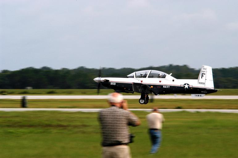 Keywords: US Navy 030807-N-0000X-001 The T-6 Texan training aircraft takes off from the flight line at Naval Air Station (NAS) Pensacola.jpg en Naval Air Station Pensacola Fla Aug 7 2003 -- The T-6 Texan training aircraft takes off from the flight line at Naval Air Station NAS Pensacola The Texan will replace the Navy s T-34C Turbo Mentors and the Air Force T-37B Tweety Bird as the primary pilot training aircraft at both NAS Pensacola and NAS Whiting Field Only one model of aircraft will be used for training Air Force and Navy pilots as part of the Department of Defense s effort to streamline military training operations reduce costs while increasing efficiency U S Navy photo RELEASED 2003-08-07 030807-N-0000X-001 Navy http //www navy mil/view_image asp id 8888 U S Navy photo PD-USGov-Military-Navy Beechcraft T-6 Texan II Naval Air Station Pensacola