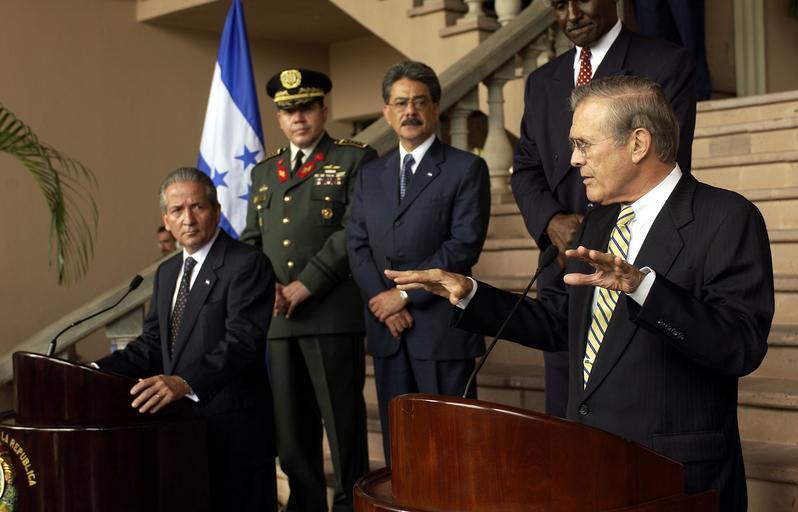 | Keywords: US Navy 030820-F-2828D-168 Secretary of Defense Donald H. Rumsfeld (right) answers a question from the media during a joint press conference with Honduran President Ricardo Maduro.jpg en Tegucigalpa Honduras Aug 20 2003 -- Secretary of Defense Donald H Rumsfeld right answers a question from the media during a joint press conference with Honduran President Ricardo Maduro left at the Presidential House in Tegucigalpa Honduras Rumsfeld is in Honduras to meet with Maduro and to thank the Honduran government for sending troops to Iraq in support of the coalition forces U S Air Force photo by Tech Sgt Andy Dunaway RELEASED 2003-08-20 030820-F-2828D-168 Navy http //www navy mil/view_image asp id 9137 U S Navy photo PD-USGov-Military-Navy Images from US Navy location Tegucigalpa Honduras Ricardo Maduro Donald Rumsfeld in 2003 |