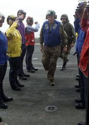 | Keywords: US Navy 030827-N-2954M-002 Chairman, Armed Services Committee and Former Secretary of the Navy, Sen. John Warner (R-Va.) passes through the rainbow side boys.jpg en Atlantic Ocean Aug 27 2003 -- Chairman Armed Services Committee and Former Secretary of the Navy Sen John Warner R-Va passes through the rainbow side boys during arrival honors aboard the amphibious assault ship USS Iwo Jima LHD 7 Warner visited the ship to meet with Sailors and Marines of the Iwo Jima Amphibious Ready Group ARG currently on station off the coast of Liberia in support of peace-keeping missions During his stay Warner dined with Sailors and Marines and held an all-hands call in the ship's hangar bay U S Navy photo by Photographer's Mate 3rd Class Julianne Metzger RELEASED 2003-08-27 030827-N-2954M-002 Navy http //www navy mil/view_image asp id 9270 U S Navy photo by Photographer's Mate 3rd Class Julianne Metzger PD-USGov-Military-Navy Aboard USS Iwo Jima LHD-7 Rainbow sideboys John Warner Salutes |