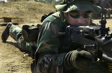 Camp Roberts, Calif (Sept 27th, 2003) - - A U.S. Navy SEAL assigned to Naval Special Warfare Group ONE - Detachment 219 (Reserve) takes aim with an M-60 machine gun during live fire training at Camp Roberts, Calif. The detachment is conducting weekend drills to improve their skills in heavy weapons and field craft to better support forward deployed units. Naval Special Warfare Group One, Reserve Detachment 219, homeported in Port Hueneme, Calif is a Naval Reserve combat support detachment which provides support to active duty Naval Special Warfare commands while forward deployed. U.S. Navy Photo by Photographer's Mate 1st Class Arlo Abrahamson.