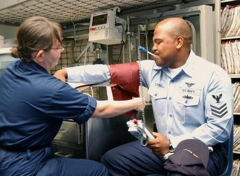 | Keywords: US Navy 031003-N-0000W-002 Hospital Corpsman 3rd Class Cynthia Alexander, from Harvey, Ill., checks the temperature and blood pressure of Aviation Ordnanceman 1st Class Marcus Campbell.jpg en Aboard USS Kitty Hawk CV 63 Oct 3 2003 -- Navy Hospital Corpsman 3rd Class Cynthia Alexander from Harvey Ill checks the temperature and blood pressure of Aviation Ordnanceman 1st Class Marcus Campbell from Meridian Miss aboard USS Kitty Hawk CV 63 Kitty Hawk is the Navy's only forward-deployed aircraft carrier and played a key role in Operation Iraqi Freedom U S Navy photo by Tom Watanabe RELEASED 2003-10-03 031003-N-0000W-002 Navy http //www navy mil/view_image asp id 9945 U S Navy photo by Tom Watanabe PD-USGov-Military-Navy Aboard USS Kitty Hawk CV-63 Aviation Ordnanceman |
