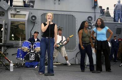 | Keywords: US Navy 031003-N-9414C-256 Benfold Band provides entertainment for the guests participating in USS Benfold^rsquo,s (DDG 65) Tiger Cruise.jpg en Pacific Ocean Oct 3 2003 -- The Benfold Band consisting of Electronics Technician 3rd Class Cassie Frels on lead vocal Mess Management Specialist 2nd Class Wright and Engineman Fireman Vasquez on back up vocals Seaman Mehrman on drums and Electronics Technician 1st Class Walker on guitar provided entertainment for the guests participating in USS Benfold s DDG 65 Tiger Cruise during Fleet Week San Diego A tiger cruise allows a Sailor s family and friends the opportunity to embark aboard U S Navy ships for a short duration underway period to experience Navy life at sea U S Navy photo by Photographer's Mate 3rd Class Bre' N Cameron-Smith RELEASED 2003-10-03 031003-N-9414C-256 Navy http //www navy mil/view_image asp id 9948 U S Navy photo by Photographer's Mate 3rd Class Bre' N Cameron-Smith PD-USGov-Military-Navy Aboard USS Benfold DDG-65 Fleet_Week_San_Diego Concerts in San Diego |