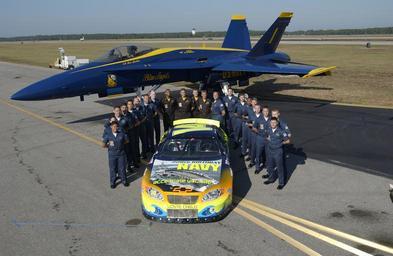 | Keywords: US Navy 031108-N-5862D-009 Members of the U.S. Navy Flight Demonstration Team, the Blue Angels, pose with the Navy Sponsored Chevrolet Monte Carlo Busch Series race car.jpg en Naval Air Station NAS Pensacola Fla Nov 8 2003 -- Members of the U S Navy Flight Demonstration Team the Blue Angels pose with the Navy Sponsored Chevrolet Monte Carlo Busch Series race car at Sherman Field onboard Naval Air Station NAS Pensacola The car owned by the Fitz-Bradshaw racing team was on hand for the Blue Angels homecoming air show where an estimated 100 000 spectators watched the final performance of the Blue Angels for the 2003 season U S Navy photo by Chief Photographer s Mate Chris Desmond RELEASED 031108-N-5862D-009 Navy http //www navy mil/view_image asp id 10513 U S Navy photo by Chief Photographer s Mate Chris Desmond PD-USGov-Military-Navy Trail Motorsport Blue Angels F/A-18 Hornet in 2003 Forrest Sherman Field |