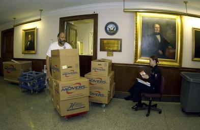 | Keywords: US Navy 031113-N-9693M-004 Danny Brooks pushes boxes out of the office.jpg en Danny Brooks an Office Movers employee pushes boxes out of the office of the Secretary of the Navy SECNAV as Yeoman 2nd Class Tianni Craig studies a college course outside the office The Dept of the Navy Executive Corridor offices of the SECNAV Under SECNAV Chief of Naval Operations CNO Commandant of the Marine Corps CMC Vice CNO and Assistant CMC are being relocated for two years to office spaces in wedge two within the Pentagon The move marks the first time since the opening of the Pentagon that the DoN senior leadership has moved U S Navy photo by Damon J Moritz 2003-11-13 031113-N-9693M-004 Navy http //www navy mil/view_image asp id 10575 U S Navy photo by Damon J Moritz PD-USGov-Military-Navy People of the United States Navy Secretary of the Navy's office |
