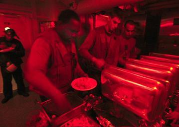 | Keywords: US Navy 031127-N-9742R-001 Flight deck personnel help themselves to a Thanksgiving dinner aboard USS Enterprise.jpg en Arabian Gulf Nov 27 2003 -- Flight deck personnel help themselves to a Thanksgiving dinner aboard USS Enterprise CVN 65 served by Mess Management Specialists under dim red lights within the aircraft carrier's island superstructure During night flight operations red lights help conserve the night vision of flight deck personnel U S Navy photo by Photographer's Mate Airman Milosz Reterski RELEASED 2003-11-27 031127-N-9742R-001 Navy http //www navy mil/view_image asp id 10848 U S Navy photo by Photographer's Mate Airman Milosz Reterski PD-USGov-Military-Navy Aboard USS Enterprise CVN-65 Thanksgiving food Red Military activities at night Thanksgiving in the Military of the United States Thanksgiving 2003 November 2003 2003 in water transport People of the United States in 2003 Photographs taken on 2003-11-27 Thanksgiving onboard watercraft |