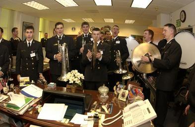 | Keywords: US Navy 031204-N-9693M-044 U.S. Naval Academy Midshipmen band members lead a cheer in the office of Vice Adm. Gordon S. Holder, Joint Staff director of logistics, in the Pentagon during a Go Navy, Beat Army pep rally.jpg en U S Naval Academy Drum and Bugle Corps members lead a cheer in the office of Vice Adm Gordon S Holder Joint Staff director of logistics in the Pentagon during a Go Navy Beat Army pep rally in advance of the 104th Army vs Navy game scheduled for Saturday December 6th at Lincoln Financial Field in Philadelphia Pa With a win against the Army Black Knights Navy 7-4 is this year s front-runner to win the military academies' coveted Commander-in-Chief s trophy held by the Air Force for the last six consecutive years U S Navy photo by Damon J Moritz RELEASED 2003-12-04 031204-N-9693M-044 Navy http //www navy mil/view_image asp id 10845 U S Navy photo by Damon J Moritz PD-USGov-Military-Navy People of the United States Navy |