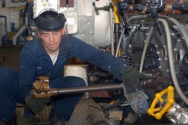 | Keywords: US Navy 031206-N-5464G-002 Machinist^rsquo,s Mate Fireman Steven Kuhn, from Churchill, Tenn., performs a pull, inspect and clean check (PIC) on the number four bravo boiler.jpg en 7th Fleet Area of Responsibility Dec 6 2003 -- Machinist s Mate Fireman Steven Kuhn from Churchill Tenn performs a pull inspect and clean check PIC on the number four bravo boiler aboard USS Kitty Hawk CV 63 The PIC check cleans excess carbon from the burner barrel atomizer reducing fuel consumption and making the boiler more efficient Kitty Hawk is America s oldest active warship comminisioned in 1961 and is the U S Navy's only forward deployed aircraft carrier U S Navy photo by Photographer s Mate Airman Theron J Godbold RELEASED 2003-12-06 031206-N-5464G-002 Navy http //www navy mil/view_image asp id 10939 U S Navy photo by Photographer s Mate Airman Theron J Godbold PD-USGov-Military-Navy Aboard USS Kitty Hawk CV-63 Overalls |
