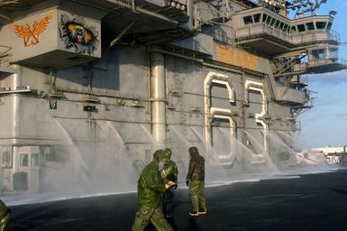 | Keywords: US Navy 040116-N-7575W-001 Members of the Navy^rsquo,s Board of Inspection and Survey (INSURV) check USS Kitty Hawk^rsquo,s (CV 63) counter-measure wash down system.jpg en Philippine Sea Jan 16 2004 -- Members of the Navy s Board of Inspection and Survey INSURV check USS Kitty Hawk s CV 63 counter-measure wash down system The counter-measure wash down system consists of piping and a series of nozzles specially designed to spray a large amount of water and Aqueous Film Forming Foam AFFF on all open weather deck surfaces in the event of a chemical biological or radiological attack and major damage control and firefighting These required inspections evaluate ship material condition and operational capability Kitty Hawk is America s oldest active warship and is forward deployed to Yokosuka Japan U S Navy photo by Photographer s Mate 3rd Class Jason R Williams RELEASED 2004-01-16 040116-N-7575W-001 Navy http //www navy mil/view_image asp id 11410 U S Navy photo by Photographer s Mate 3rd Class Jason R Williams PD-USGov-Military-Navy Aboard USS Kitty Hawk CV-63 Aqueous Film Forming Foam 63 number |