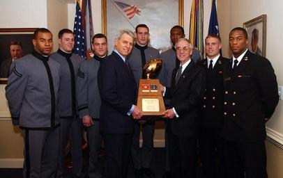 | Keywords: US Navy 040122-N-2568S-001 Cadets from the U.S. Military Academy West Point, and Midshipmen from the U.S. Naval Academy join Secretary of the Navy, the Honorable Gordon R. England.jpg en Cadets from the U S Military Academy West Point and Midshipmen from the U S Naval Academy join Secretary of the Navy the Honorable Gordon R England and Acting Secretary of the Army the Honorable Les Brownlee for a group photo with the Secretary's Trophy awarded to the U S Navy Football Team following their winning 8-5 season U S Navy photo by Chief Journalist Craig P Strawser 2004-01-22 040122-N-2568S-001 Navy http //www navy mil/view_image asp id 11635 U S Navy photo by Chief Journalist Craig P Strawser PD-USGov-Military-Navy Les Brownlee Army Black Knights football Gordon R England Navy Midshipmen football players People receiving trophies or awards Secretary's Trophy |