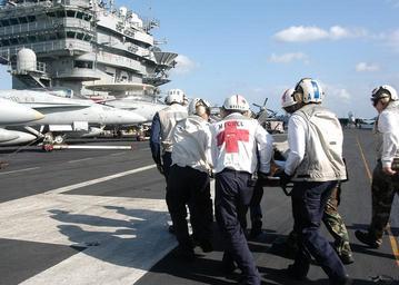 | Keywords: US Navy 040125-N-6278K-002 USS George Washington (CVN 73) provides emergency medical care to an Italian sailor at sea.jpg en Atlantic Ocean Jan 25 2004 Flight deck personnel carry Mr Giovanni Cutugno to the ship s medical facility aboard USS George Washington CVN 73 Cutugno was transported by helicopter from the Italian merchant vessel Isolaverde after the Captain of the Italian vessel radioed George Washington stating that he needed medical assistance for an injured sailor Washington dispatched an HH-60H Seahawk helicopter assigned to the Nightdippers of Helicopter Anti-submarine Squadron Five HS-5 to transport the wounded sailor to the nuclear powered aircraft carrier for proper medical attention Gutugno received treatment in the ship s medical department for several deep lacerations around his face and an injury to his right leg after falling down a ships ladder U S Navy photo by Photographer s Mate Airman Joan Kretschmer RELEASED 2004-01-25 040125-N-6278K-002 Navy http //www navy mil/view_image asp id 11556 U S Navy photo PD-USGov-Military-Navy Aboard USS George Washington CVN-73 |