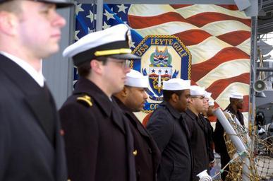 | Keywords: US Navy 040219-N-1464F-007 Officers and Sailors assigned to the guided missile cruiser USS Leyte Gulf (CG 55).jpg en Naval Station Norfolk Va Feb 19 2004 Officers and Sailors assigned to the guided missile cruiser USS Leyte Gulf CG 55 man the rails as the ship leaves for a scheduled deployment Leyte Gulf will join other elements operating with USS Wasp LHD 1 Expeditionary Strike Group ESG to conduct missions in support of the global war on terrorism U S Navy photo by Chief Journalist Dave Fliesen RELEASED 2004-02-19 040219-N-1464F-007 Navy http //www navy mil/view_image asp id 12032 U S Navy photo by Chief Journalist Dave Fliesen PD-USGov-Military-Navy Naval Station Norfolk Manning the rail in the United States Navy USS Leyte Gulf CG-55 |