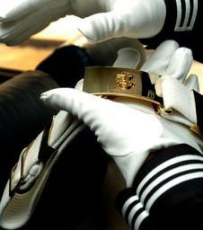 | Keywords: US Navy 040220-N-6213R-008 Airman Pedro Feliciano, of Philadelphia, Pa., shines his belt buckle while traveling to a performance as a member of the U.S. Navy Ceremonial Guard.jpg en Airman Pedro Feliciano of Philadelphia Pa shines his belt buckle while traveling to a performance as a member of the U S Navy Ceremonial Guard The unit is made up of handpicked Sailors reporting directly from Navy basic training who are specially trained to perform various military ceremonial honors U S Navy photo by Photographer's Mate 3rd Class Mark J Rebilas 2004-02-20 040220-N-6213R-008 Navy http //www navy mil/view_image asp id 12045 U S Navy photo by Photographer's Mate 3rd Class Mark J Rebilas PD-USGov-Military-Navy People of the United States Navy Uniform belts Military belt buckles White gloves Photographs by Mark J Rebilas |