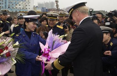 | Keywords: US Navy 040224-N-3931M-119 Vice Adm. Robert Willard, Commander U.S. Seventh Fleet, receives a traditional greeting of flowers from a representative of the People's Liberation Army (Navy).jpg en Shanghai China Feb 24 2004 Vice Adm Robert Willard Commander U S Seventh Fleet receives a traditional greeting of flowers from a representative of the People's Liberation Army Navy prior to a press conference on Gaoyang Pier while in front of the amphibious command ship USS Blue Ridge LCC 19 The U S Seventh Fleet command ship Blue Ridge is visiting Shanghai on a regularly scheduled port visit and last visited the port city in March 2001 Shanghai called Hu for short is a bustling metropolis located at the mouth of the Yangtze River Connected with Jiangsu and Zhejiang provinces in the west the city is exposed to the East China Sea in the east With a total area of 6 341 square kilometers about 2 448 square miles and a population of more than 13 million Shanghai is China s largest city Sailors and Marines from the ship and embarked staff will take an opportunity to experience the local culture and interacted with their counterparts from the People's Liberation Army Navy The amphibious command ship is forward deployed to Yokosuka Japan U S Navy photo by Photographer's Mate 1st Class Michael R McCormick RELEASED 2004-02-24 040224-N-3931M-119 Navy http //www navy mil/view_image asp id 12078 U S Navy photo by Photographer's Mate 1st Class Michael R McCormick PD-USGov-Military-Navy Unidentified locations in Shanghai Aboard USS Blue Ridge LCC-19 People with flowers Robert Willard in 2004 |