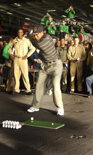 Keywords: US Navy 040303-N-5319A-008 Sailors watch professional golfer Tiger Woods hit a few golf balls during a demonstration in the hanger bay of the nuclear powered aircraft carrier USS George Washington (CVN 73).jpg en Arabian Gulf Mar 3 2004 Sailors watch professional golfer Tiger Woods hit a few golf balls during a demonstration in the hanger bay of the nuclear powered aircraft carrier USS George Washington CVN 73 Tiger Woods accompanied by his fiancé Elin Nordegren PGA player Mark O Meara and caddies Steve Williams and Greg Rita visited the Norfolk Va Based carrier in the Arabian Gulf before participating in the European PGA Tour s Dubai Desert Classic on Thursday The George Washington Carrier Strike Group CSG and Carrier Air Wing Seven CVW-7 are deployed to the Arabian Gulf in support of Operations Iraqi and Enduring Freedom U S Navy photo by Photographer's Mate 1st Class Brien Aho RELEASED 2004-03-03 040303-N-5319A-008 Navy http //www navy mil/view_image asp id 12366 U S Navy photo by Photographer's Mate 1st Class Brien Aho PD-USGov-Military-Navy Aboard USS George Washington CVN-73 Tiger Woods in 2004 |