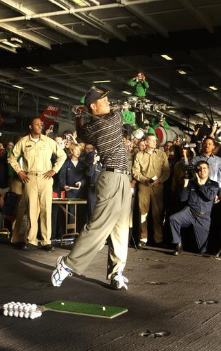 Keywords: US Navy 040303-N-5319A-009 Sailors watch professional golfer Tiger Woods hit a few golf balls during a demonstration in the hanger bay of the nuclear powered aircraft carrier USS George Washington (CVN 73).jpg en Arabian Gulf Mar 3 2004 Sailors watch professional golfer Tiger Woods hit a few golf balls during a demonstration in the hanger bay of the nuclear powered aircraft carrier USS George Washington CVN 73 Tiger Woods accompanied by his fiancé Elin Nordegren PGA player Mark O Meara and caddies Steve Williams and Greg Rita visited the Norfolk Va Based carrier in the Arabian Gulf before participating in the European PGA Tour s Dubai Desert Classic on Thursday The George Washington Carrier Strike Group CSG and Carrier Air Wing Seven CVW-7 are deployed to the Arabian Gulf in support of Operations Iraqi and Enduring Freedom U S Navy photo by Photographer's Mate 1st Class Brien Aho RELEASED 2004-03-03 040303-N-5319A-009 Navy http //www navy mil/view_image asp id 12367 U S Navy photo by Photographer's Mate 1st Class Brien Aho PD-USGov-Military-Navy Aboard USS George Washington CVN-73 Tiger Woods in 2004 |