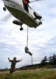Keywords: US Navy 040408-N-8921O-013 Chief Sonar Technician Todd Voorhis, of El Paso, Texas, signals to a team member assigned to Explosive Ordnance Disposal Mobile Unit Eleven (EODMU-11) that he is clear of the drop zone after completin.jpg en Oak Harbor Wash Apr 08 2004 - Chief Sonar Technician Todd Voorhis of El Paso Texas signals to a team member assigned to Explosive Ordnance Disposal Mobile Unit Eleven EODMU-11 that he is clear of the drop zone after completing his fast rope repel out of a UH-3H Sea King helicopter EODMU-11 is conducting fast rope and rappelling exercises to help prepare the team for real combat situations U S Navy photo by Photographer's Mate Airman Chris Otsen RELEASED 2004-04-08 040408-N-8921O-013 Navy http //www navy mil/view_image asp id 13173 U S Navy photo by Photographer's Mate Airman Chris Otsen PD-USGov-Military-Navy Naval Air Station Whidbey Island United States Navy Explosive Ordnance Disposal Fast roping UH-3H Sea King Explosive Ordnance Disposal Mobile Unit 11