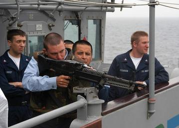 | Keywords: US Navy 040420-N-6433N-097 Crewmembers assigned to USS George Washington (CVN 73) visit the guided missile cruiser USS Vella Gulf (CG 72) to fire an M-60 rifle.jpg en Arabian Gulf Apr 20 2004 - Crewmembers assigned to USS George Washington CVN 73 visit the guided missile cruiser USS Vella Gulf CG 72 to fire an M-60 rifle from the bridge during a training exercise Vella Gulf is assigned to the USS George Washington CVN 73 Carrier Strike Group CSG The Norfolk Va -based cruiser is on a regularly scheduled deployment in support of Operation Iraqi Freedom OIF U S Navy photo by Photographer's Mate Airman Rex Nelson RELEASED 2004-04-20 040420-N-6433N-097 Navy http //www navy mil/view_image asp id 13547 U S Navy photo by Photographer's Mate Airman Rex Nelson PD-USGov-Military-Navy Aboard USS Vella Gulf CG-72 M60 machine gun |
