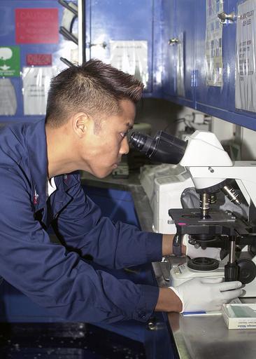 | Keywords: US Navy 040421-N-7949W-001 Hospital Corpsman 2nd Class Patrick C. Mangaran from Beach Park, Ill, examines a blood sample.jpg en At sea aboard the amphibious assault ship USS Tarawa LHA 1 Apr 21 2004 - Hospital Corpsman 2nd Class Patrick C Mangaran from Beach Park Ill examines a blood sample aboard the amphibious assault ship USS Tarawa LHA 1 Petty Officer Patrick is Tarawa's only medical laboratory technician and is responsible for all blood and culture tests preformed aboard the ship Tarawa recently conducted a Command Assessment for Readiness and Training phase II CART II evolution off the coast of Southern California U S Navy photo by Photographer's Mate 1st Class Daniel Woods RELEASED 2004-04-21 040421-N-7949W-001 Navy http //www navy mil/view_image asp id 13717 U S Navy photo by Photographer's Mate 1st Class Daniel Woods PD-USGov-Military-Navy Aboard USS Tarawa LHA-1 Hospital Corpsman |