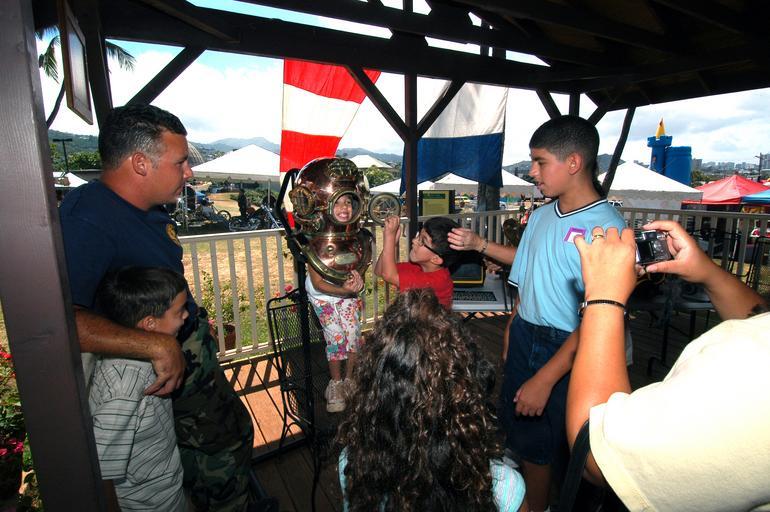 | Keywords: US Navy 040502-N-8157C-004 Operation's Specialist 2nd Class John Hall, left, a Navy diver assigned to Mobile Diving Salvage Unit One (MDSU-1), shows children a deep sea diving helmet.jpg en Honolulu Hawaii May 2 2004 - Operation's Specialist 2nd Class John Hall left a Navy diver assigned to Mobile Diving Salvage Unit One MDSU-1 shows children a deep sea diving helmet used in the early days Navy diving operations The Bishop Museum in Honolulu Hawaii hosted a Hawaii Military Appreciation Month event for military members and their families U S Navy photo by Photographer's Mate 2nd Class Dennis C Cantrell RELEASED 2004-05-02 040502-N-8157C-004 Navy http //www navy mil/view_image asp id 13838 U S Navy photo by Photographer's Mate 2nd Class Dennis C Cantrell PD-USGov-Military-Navy Images from US Navy location HONOLULU Operations Specialist United States Navy |