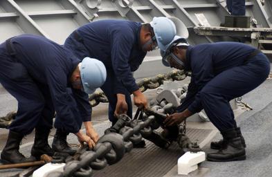 | Keywords: US Navy 040513-N-2101W-009 Deck Department Sailors aboard the guided missile cruiser USS Cowpens (CG 63) remove the chain stoppers.jpg en Shimoda Bay Japan May 13 2004 - Deck Department Sailors aboard the guided missile cruiser USS Cowpens CG 63 remove the chain stoppers before anchoring in Shimoda Bay as the crew prepares to participate in the Shimoda Black Ship Festival The ship and its crew will participate in various events held during the 65th Shimoda Black Ship Festival which celebrates the 150th anniversary of the United Stated and Japan Treaty of Peace In 1854 Japan was opened to the western world which contributed significantly to its rapid modernization U S Navy photo by Photographer's Mate 1st Class Alan Warner RELEASED 2004-05-13 040513-N-2101W-009 Navy http //www navy mil/view_image asp id 14185 U S Navy photo by Photographer's Mate 1st Class Alan Warner PD-USGov-Military-Navy Images from US Navy location Shimoda Bay Japan Anchor chains |
