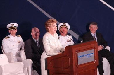 Keywords: US Navy 040522-N-6240R-191 U.S. Senator Elizabeth Dole delivers remarks as keynote speaker during the Keel Laying Ceremony for Pre-Commissioning Unit (PCU) North Carolina (SSN 777).jpg en Newport News Va May 22 2004 - U S Senator Elizabeth Dole delivers remarks as keynote speaker during the Keel Laying Ceremony for Pre-Commissioning Unit PCU North Carolina SSN 777 the U S Navy's newest Virginia-class submarine The Virginia-class nuclear-powered submarine is one of the most sophisticated machines ever built said the senator representing the state of North Carolina I look forward to the day this North Carolina namesake sets out on its course to protect our country PCU North Carolina is the 4th Virginia-class submarine to begin construction and is the 6th Navy vessel to be named North Carolina The Ship's sponsor Mrs Linda Bowman said For the submarine North Carolina my hope is that she will sail in peace to keep us free My assurance is that she will always be ready to defend that freedom whenever necessary The current construction schedule calls for the submarine's launching in late 2005 followed by commissioning in late 2007 U S Navy photo by Journalist 1st Class Donald P Rule RELEASED 2004-05-22 040522-N-6240R-191 Navy http //www navy mil/view_image asp id 14573 U S Navy photo by Journalist 1st Class Donald P Rule PD-USGov-Military-Navy Newport News Shipbuilding Keel-laying ceremonies USS North Carolina SSN-777