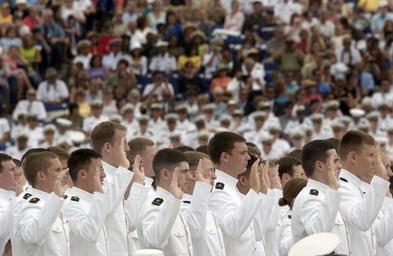 | Keywords: US Navy 040528-N-9693M-014 Midshipmen stand during the administration of Oath of Office for graduates entering service as a Navy Ensign during the U.S. Naval Academy class of 2004 graduation.jpg en U S Naval Academy May 28 2004 - Midshipmen stand during the administration of Oath of Office for graduates entering service as a Navy Ensign during the U S Naval Academy class of 2004 graduation and commissioning ceremony Nine hundred-ninety Midshipmen graduated from the U S Naval Academy and became commissioned officers in the U S Military Chairman of the Joint Chiefs of Staff Gen Richard B Myers delivered the commencement address and personally greeted each graduate during the ceremony The men and women of the graduating class were sworn into the Navy as Ensigns or into the Marine Corps as Second Lieutenants Six hundred sixty-one graduates chose to continue their career as Naval officers U S Navy photo by Photographer's Mate 2nd Class Damon J Moritz RELEASED 2004-05-28 040528-N-9693M-014 Navy http //www navy mil/view_image asp id 14485 U S Navy photo by Photographer's Mate 2nd Class Damon J Moritz PD-USGov-Military-Navy Graduation and Commissioning Ceremony May 28 2004 Oath of office Taken with Nikon D1X |