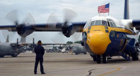 | Keywords: US Navy 040604-N-7559C-001 With the National Ensign flying, U.S. Marine Corps Sgt Baron Morales, from Miami, Fla., monitors the engine start of the Blue Angels C-130 Hercules transport plane Fat Albert.jpg en Myrtle Beach International Airport S C June 4 2004 - With the National Ensign flying U S Marine Corps Sgt Baron Morales from Miami Fla monitors the engine start of the Blue Angels C-130 Hercules transport plane Fat Albert The Blue Angels use Fat Albert to fly 45 maintenance and support personal with their gear to each of the 34 show sites Fat Albert opens most shows demonstrating its Jet-Assisted Takeoff JATO capability The Blue Angels fly the F/A-18A Hornet as they perform approximately 30 maneuvers during the aerial demonstration which runs approximately an hour and 15 minutes U S Navy photo by Photographer's Mate 2nd Class Ryan J Courtade RELEASED 2004-06-04 040604-N-7559C-001 Navy http //www navy mil/view_image asp id 14777 U S Navy photo by Photographer's Mate 2nd Class Ryan J Courtade PD-USGov-Military-Navy Images from US Navy location Myrtle Beach International Airport S C Fat Albert C-130T Hercules |