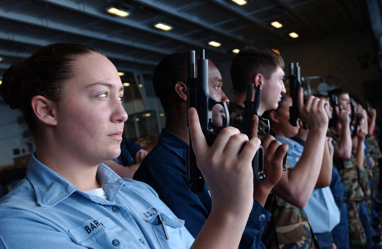 | Keywords: US Navy 040607-N-2788L-072 Sailors temporarily assigned to the Security Department aboard USS Ronald Reagan (CVN 76) await instructions prior to completing a weapons familiarization course.jpg en South Atlantic Ocean Jun 7 2004 - Sailors temporarily assigned to the Security Department aboard USS Ronald Reagan CVN 76 await instructions prior to completing a weapons familiarization course in the ship's hangar bay Reagan is in the South Atlantic Ocean circumnavigating South America during her transit to her new homeport of San Diego Calif while participating in exercises supporting Summer Pulse 2004 Summer Pulse 2004 is the simultaneous deployment of seven aircraft carrier strike groups CSGs demonstrating the ability of the Navy to provide credible combat power across the globe in five theaters with other U S allied and coalition military forces Summer Pulse is the Navy first deployment under its new Fleet Response Plan FRP U S Navy photo by Photographer's Mate Airman Paul H Laverty Jr RELEASED For more information go to <a href http //www cffc navy mil/summerpulse04 htm Target _BLANK >www cffc navy mil/summerpulse04 htm</a> 2004-06-07 040607-N-2788L-072 Navy http //www navy mil/view_image asp id 14945 U S Navy photo by Photographer's Mate Airman Paul H Laverty Jr PD-USGov-Military-Navy Hangar bays of USS Ronald Reagan CVN-76 |