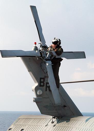 | Keywords: US Navy 040608-N-1512S-036 A pilot from USS Detroit (AOE 4) checks the tail rotor on a MH-60S Knighthawk for safe flight while aboard the amphibious assault ship USS Kearsarge (LHD 3).jpg  en Atlantic Ocean June 8 2004 A pilot from USS Detroit AOE 4 checks the tail rotor on a MH-60S Knighthawk for safe flight while aboard the amphibious assault ship USS Kearsarge LHD 3 Kearsarge is currently deployed to transport elements of the 24th Marine Expeditionary Unit MEU Air Combat Element to the Central Command Area of Responsibility AOR in support of Operation Iraqi Freedom OIF U S Navy photo by Photographer s Mate Airman Kenny Swartout RELEASED 2004-06-08 040608-N-1512S-036 Navy http //www navy mil/view_image asp id 14855 U S Navy photo by Photographer s Mate Airman Kenny Swartout PD-USGov-Military-Navy Aboard USS Kearsarge LHD-3 |