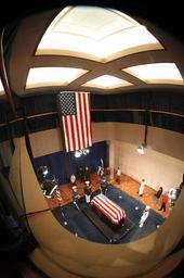 | Keywords: US Navy 040608-N-8164H-021 Mourners pay their respects to former President Ronald Reagan as his casket lays in repose at the Ronald Reagan Presidential Library in Simi Valley, Calif.jpg en Simi Valley Calif Jun 9 2004 - Mourners pay their respects to former President Ronald Reagan as his casket lays in repose at the Ronald Reagan Presidential Library in Simi Valley Calif Reagan's body will be flown to Washington D C where it will lie in state in the Capitol Rotunda A state funeral will be conducted late Friday morning at the Washington National Cathedral where President Bush will give the eulogy On Friday June 11 President Reagan's body will return to Calif for a private burial service U S Navy photo by Photographer's Mate 3rd Class Shane M Hadlick RELEASED 2004-06-09 040608-N-8164H-021 Navy http //www navy mil/view_image asp id 14785 U S Navy photo by Photographer's Mate 3rd Class Shane M Hadlick PD-USGov-Military-Navy Ronald Reagan Tomb 2004 |