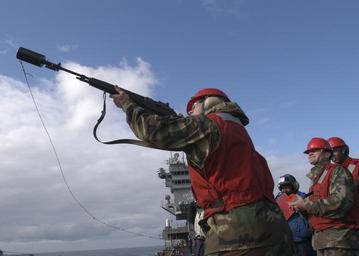 | Keywords: US Navy 040618-N-9742R-022 Aviation Ordnanceman 3rd Class Cory Jones, from Wichita, Kan., takes aim prior to shooting a shot line from the flight deck of the aircraft carrier USS Enterprise (CVN 65) to the fast combat support s.jpg en Atlantic Ocean Jun 18 2004 - Aviation Ordnanceman 3rd Class Cory Jones from Wichita Kan takes aim prior to shooting a shot line from the flight deck of the aircraft carrier USS Enterprise CVN 65 to the fast combat support ship USS Detroit AOE 4 The shot line will allow personnel to set up a phone line and a distance line between the two ships establishing direct ship-to-ship telephone communication during an ammunition offload Enterprise and Detroit are currently underway in support of Summer Pulse 2004 Exercise Summer Pulse 2004 is the simultaneous deployment of seven aircraft carrier strike groups CSGs demonstrating the ability of the Navy to provide credible combat across the globe in five theaters with other U S allied and coalition military forces Summer Pulse is the Navy's first deployment under its new Fleet Response Plan FRP U S Navy photo by Photographer's Mate 3rd Class Milosz Reterski RELEASED 2004-06-18 040618-N-9742R-022 Navy http //www navy mil/view_image asp id 15219 U S Navy photo by Photographer's Mate 3rd Class Milosz Reterski PD-USGov-Military-Navy USS Enterprise CVN-65 flight deck Aviation Ordnanceman Gunner's Mate underway replenishment M14 rifle fireing shot line |