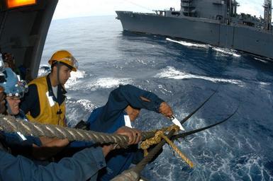 | Keywords: US Navy 040619-N-8704K-001 Boatswain Mate 3rd Class Joanna Saldana cuts the rope off a span wire aboard the aircraft carrier USS John F. Kennedy (CV 67) during an underway replenishment.jpg en Atlantic Ocean Jun 19 2004 - Boatswain Mate 3rd Class Joanna Saldana cuts the rope off a span wire aboard the aircraft carrier USS John F Kennedy CV 67 during an underway replenishment with fast combat support ship USS Seattle AOE 3 Kennedy is one of seven aircraft carriers involved in Summer Pulse 2004 Summer Pulse 2004 is the simultaneous deployment of seven aircraft carrier strike groups CSGs demonstrating the ability of the Navy to provide credible combat power across the globe in five theaters with other U S allied and coalition military forces Summer Pulse is the Navy s first deployment under its new Fleet Response Plan FRP U S Navy photo by Photographer s Mate 3rd Class Joshua Karsten RELEASED For more information go to <a href http //www cffc navy mil/summerpulse04 htm Target _BLANK >www cffc navy mil/summerpulse04 htm</a> 2004-06-19 040619-N-8704K-001 Navy http //www navy mil/view_image asp id 15238 U S Navy photo by Photographer s Mate 3rd Class Joshua Karsten PD-USGov-Military-Navy USS Seattle AOE-3 Ropes |