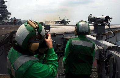 | Keywords: US Navy 040620-N-9964S-015 Photographer^rsquo,s Mate 3rd Class Dustin Gates takes a photo of Airman Monica Early.jpg en Atlantic Ocean June 20 2004 Photographer s Mate 3rd Class Dustin Gates takes a photo of Airman Monica Early while she stands bow safety watch during the launch of an F-14B Tomcat assigned to the Swordsmen of Fighter Squadron Thirty Two VF-32 aboard USS Harry S Truman CVN 75 Truman is one of seven aircraft carriers involved in the Summer Pulse '04 The Strike Group is conducting a scheduled training exercise followed by overseas pulse operations Summer Pulse 2004 is the simultaneous deployment of seven aircraft strike groups CSG s demonstrating the ability of the Navy to provide credible combat across the globe in five theaters with other U S allied and coalition military forces Summer Pulse is the Navy s first deployment under its new Fleet Response Plan FRP U S Navy photo by Photographer s Mate 2nd Class Christopher B Stoltz RELEASED For more information about Summer Pulse 2004 visit <a href http //www cffc navy mil/summerpulse04 htm Target _BLANK >www cffc navy mil/summerpulse04 htm</a> 2004-06-20 040620-N-9964S-015 Navy http //www navy mil/view_image asp id 15348 U S Navy photo by Photographer s Mate 2nd Class Christopher B Stoltz PD-USGov-Military-Navy F/A-18C Hornet on flight decks Fighter Squadron 32 United States Navy Aboard USS Harry S Truman CVN-75 Photographers Mate |