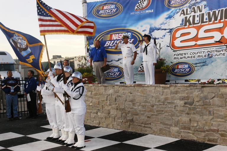 | Keywords: US Navy 040626-N-2899A-002 Members of the Navy Color Guard and a Navy musician assigned to the Navy Band Great Lakes presented the National Ensign and Anthem during pre-race ceremonies.jpg en Milwaukee Wis June 26 2004 - Members of the Navy Color Guard and a Navy musician assigned to the Navy Band Great Lakes presented the National Ensign and Anthem during pre-race ceremonies for the Milwaukee Miles NASCAR Craftsman Truck Series Black Cat Fireworks 200 and Busch Series Alan Kulwicki 250 races Several Navy recruiters were on hand to answer questions about the Navy while one of the No 14 Navy Chevy Monte Carlo stock cars was on hand for fans to view The Fitz-Bradshaw owned car is sponsored by the Navy to assist with the Accelerate Your Life recruiting campaign U S Navy photo by Lt Cmdr Scott M Allen RELEASED 2004-06-26 040626-N-2899A-002 Navy http //www navy mil/view_image asp id 15591 U S Navy photo by Lt Cmdr Scott M Allen PD-USGov-Military-Navy Photographs of military flags of the United States Milwaukee Wisconsin Milwaukee Mile Musician United States Navy Color guards of the United States Navy 2004 in NASCAR Busch Series |
