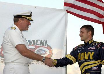 | Keywords: US Navy 040626-N-5576W-017 Vice Commander, Space and Naval Warfare Systems Command, Rear Adm. Michael A. Sharp shakes the hand of the Navy sponsored No. 14 Chevy Monte Carlo NASCAR driver Casey Atwood.jpg en Milwaukee Wis June 26 2004 - Vice Commander Space and Naval Warfare Systems Command Rear Adm Michael A Sharp shakes the hand of the Navy sponsored No 14 Chevy Monte Carlo NASCAR driver Casey Atwood during pre-race ceremonies at the Busch Series Alan Kulwicki 250 race Rear Adm Sharp administered the oath of enlistment to 20 new recruit Sailors during other pre-race ceremonies Several Navy recruiters were on hand to answer questions about the Navy while one of the No 14 Navy Chevy Monte Carlo stock cars was on hand for fans to view The Fitz-Bradshaw owned car is sponsored by the Navy to assist with the Accelerate Your Life recruiting campaign U S Navy photo by Photographer's Mate 1st Class Michael Worner RELEASED 2004-06-26 040626-N-5576W-017 Navy http //www navy mil/view_image asp id 15594 U S Navy photo by Photographer's Mate 1st Class Michael Worner PD-USGov-Military-Navy Milwaukee Wisconsin Casey Atwood |
