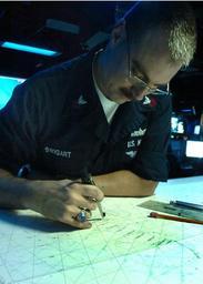 | Keywords: US Navy 040702-N-2613R-011 Operations Specialist 1st Class Robert G. Swigart, of Fountain Valley, Calif., plots the position of the amphibious assault ship USS Belleau Wood LHA 3.jpg en Arabian Gulf July 2 2004 Operations Specialist 1st Class Robert G Swigart of Fountain Valley Calif plots the position of the amphibious assault ship USS Belleau Wood LHA 3 in the Combat Information Center CIC The Belleau Wood Expeditionary Strike Group Three ESG-3 is comprised of the amphibious transport dock ship USS Denver LPD 9 amphibious dock landing ship USS Comstock LSD 45 guided missile destroyers USS Hopper DDG 70 and USS Preble DDG 88 guided missile cruiser USS Mobile Bay CG 53 and fast-attack submarine USS Charlotte SSN 766 and elements of the 11th Marine Expeditionary Unit MEU special operations capable SOC ESG forces provide a national defense asset capable of conducting sustained combat operations and humanitarian assistance from sea or shore ESG-3 is currently deployed in support of the global war on terrorism U S Navy photo by Photographer s Mate 2nd Class Erich J Ryland RELEASED 2004-07-02 040702-N-2613R-011 Navy http //www navy mil/view_image asp id 15854 U S Navy photo by Photographer s Mate 2nd Class Erich J Ryland PD-USGov-Military-Navy Aboard USS Belleau Wood LHA-3 Operations Specialist United States Navy |
