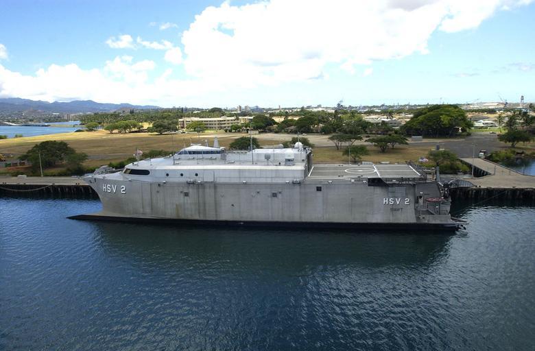 | Keywords: US Navy 040706-N-6811L-243 The experimental High Speed Vessel Two HSV 2 sits pierside Pearl Harbor, Hawaii.jpg en Pearl Harbor Hawaii July 6 2004 - The experimental High Speed Vessel Two HSV 2 Swift sits pierside Pearl Harbor Hawaii where it will participate in the exercise Rim of the Pacific RIMPAC 2004 RIMPAC is the largest international maritime exercise in the waters around the Hawaiian Islands This years exercise includes seven participating nations; Australia Canada Chile Japan South Korea the United Kingdom and the United States RIMPAC is intended to enhance the tactical proficiency of participating units in a wide array of combined operations at sea while enhancing stability in the Pacific Rim region U S Navy photo by Photographer's Mate 1st Class David A Levy RELEASED For more information go to <a href http //www cpf navy mil/RIMPAC2004 Target _BLANK >http //www cpf navy mil/RIMPAC2004</a>/ 2004-07-06 040706-N-6811L-243 Navy http //www navy mil/view_image asp id 15939 U S Navy photo by Photographer's Mate 1st Class David A Levy PD-USGov-Military-Navy General views of HSV-2 Swift Ships facing left HSV-2 Swift at Pearl Harbor RIMPAC 2004 |