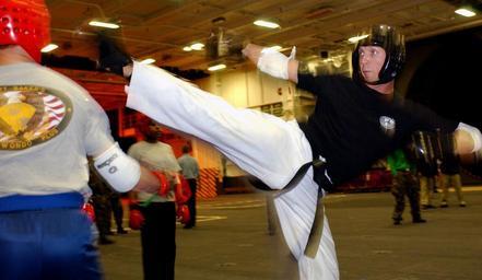 | Keywords: US Navy 040706-N-7130B-001 Senior Chief Yeoman Scott Baker, from Clinton, Mo., a 4th degree black belt and certified Tae Kwon Do instructor, spars with a student during a class held nightly aboard USS Ronald Reagan (CVN 76).jpg en Pacific Ocean July 6 2004 - Senior Chief Yeoman Scott Baker from Clinton Mo a 4th degree black belt and certified Tae Kwon Do instructor spars with a student during a class held nightly aboard USS Ronald Reagan CVN 76 Reagan is participating in Summer Pulse 2004 the simultaneous deployment of seven carrier strike groups CSGs demonstrating the ability of the Navy to provide credible combat across the globe in five theaters with other U S allied and coalition military forces Summer Pulse is the Navy s first deployment under its new Fleet Response Plan FRP Reagan is expected to arrive in late July to its new homeport of Naval Air Station North Island San Diego U S Navy photo by Photographers Mate Airman Aaron Burden RELEASE For more information go to <a href http //www cffc navy mil/summerpulse04 htm Target _BLANK >www cffc navy mil/summerpulse04 htm</a> 2004-07-06 040706-N-7130B-001 Navy http //www navy mil/view_image asp id 16146 U S Navy photo PD-USGov-Military-Navy Obi in martial arts Hangar bays of USS Ronald Reagan CVN-76 |