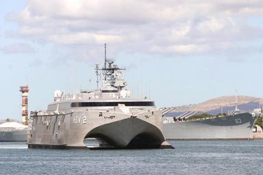 | Keywords: US Navy 040707-N-3228G-002 High Speed Vessel Two HSV-2 Swift maneuvers around Ford Island near the battleship USS Missouri BB 63.jpg en Pearl Harbor Hawaii July 7 2004 - High Speed Vessel Two HSV-2 Swift maneuvers around Ford Island near the battleship USS Missouri BB 63 while shifting berths in Pearl Harbor Hawaii Swift is taking part in the multi-national maritime exercise Rim of the Pacific 2004 RIMPAC RIMPAC is the largest international maritime exercise in the waters around the Hawaiian Islands This year s exercise includes seven participating nations; Australia Canada Chile Japan South Korea United Kingdom and United States RIMPAC is intended to enhance the tactical proficiency of participating units in a wide array of combined operations at sea while enhancing stability in the Pacific Rim region U S Navy photo by Photographer's Mate 1st Class William R Goodwin RELEASED For more information go to <a href http //www cpf navy mil/RIMPAC2004 Target _BLANK >http //www cpf navy mil/RIMPAC2004</a> 2004-07-07 040707-N-3228G-002 Navy http //www navy mil/view_image asp id 15893 U S Navy photo by Photographer's Mate 1st Class William R Goodwin PD-USGov-Military-Navy General views of HSV-2 Swift Ships facing right RIMPAC 2004 Battleship Missouri Memorial Photographs by William R Goodwin |
